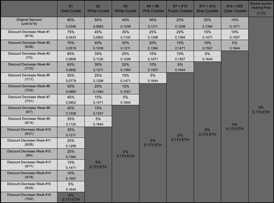 <table><thead><tr><th width="343.3333333333333">Access Crystal Number</th><th width="174">Discount</th><th>Mint price</th></tr></thead><tbody><tr><td>#1 (gold crystal)</td><td>80%</td><td>0.03462 ETH</td></tr><tr><td>#2 (White crystal)</td><td>50%</td><td>0.08655 ETH</td></tr><tr><td>#3 (White Crystal)</td><td>40%</td><td>0.10376 ETH</td></tr><tr><td>#4 > #6 (Pink Crystals)</td><td>30%</td><td>0.12117 ETH</td></tr><tr><td>#7 > #10 (Purple Crystals)</td><td>25%</td><td>0.129825 ETH</td></tr><tr><td>#11 > #15 (Blue Crystals)</td><td>20%</td><td> 0.13848 ETH</td></tr><tr><td>#16 > #25 (Clear Crystals)</td><td>15%</td><td>0.147135 ETH</td></tr></tbody></table>