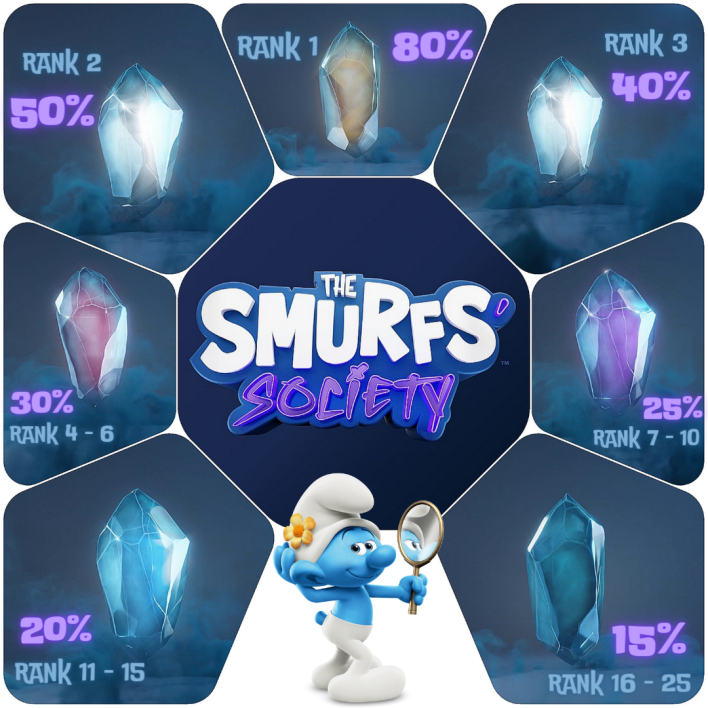 For each of the initial 200 unique Smurf characters, 25 crystals were made available through gamification. Each crystal is a ticket to the Allow List, guaranteeing the purchase of a specific Smurf character at a discounted price (Mint price of **0.173 ETH** was determined based on the clearing price of the [bucket auction](https://wiki.thesmurfssociety.com/the-smurfs-society/general-information/drop-and-reveal-process/2.-the-bucket-auction)).&#x20;